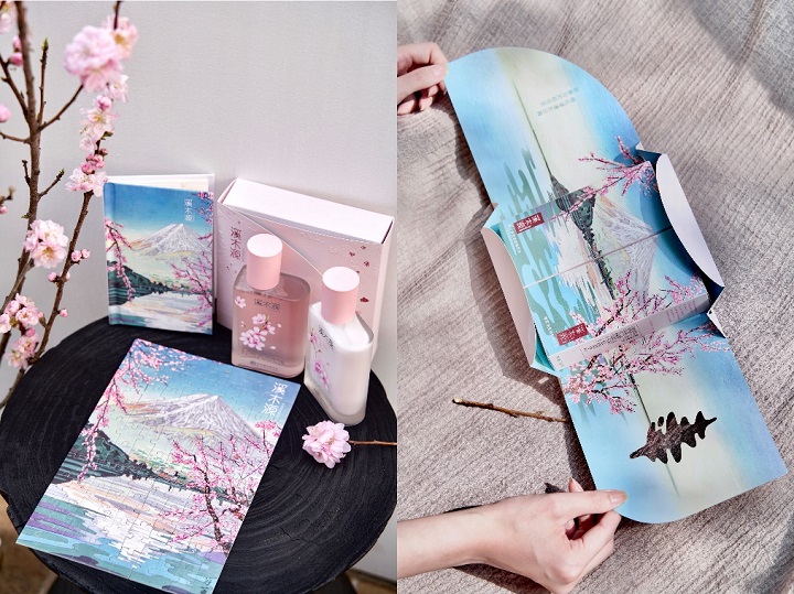 为了让生活艺术之美陪伴在消费者左右,溪木源不仅对礼盒包装进行二次DIY的设计——只需沿着虚线折叠粘贴便能DIY出一幅充满春意的樱花浮世复刻画,还精心准备了浮世绘限定手记本和浮世绘艺术拼图周边,鼓励消费者时刻记录生活与自然的美好,让自然与艺术予人疗愈和幸福感。